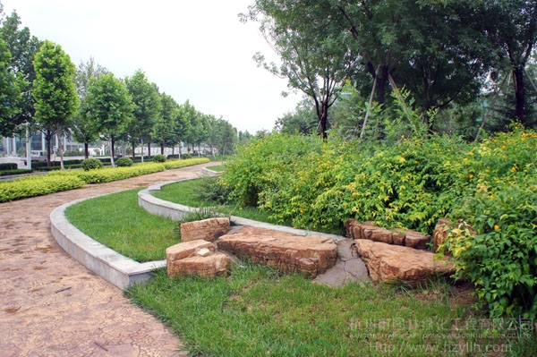 山东寿光市东环路东侧绿化改造工程(圣城街-北环路)面积9万平方米,施工范围为机动车道与非机动车道之间2.5米的隔离绿化带和30多米宽的路侧绿化带,施工内容包括土方地形整理、绿化种植、园路铺装、景石摆放、景观小品营建等。2009年9月开工,2010年7月竣工。经过2年的精心养护,如今,这里树木葱郁,花草繁茂,一路走来,随着多种风格的园路在脚下延伸,风景也在眼前不断变化。
