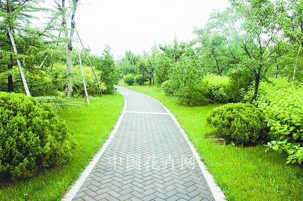 而在道路十字路口的节点处,则主要是用10厘米×10厘米的小花岗岩铺地,铺出来的路面整洁、平坦,看似简单,实则对施工技术要求相当高。草坪中的地面铺装,则采用花岗岩汀步,用错缝铺装法,两块花岗岩之间用草皮镶嵌,就像给每块花岗岩镶了一道绿边,与旁边的草坪和谐地融为一体。贯穿整个工程的游憩步道,全部采用“人字形”的铺装方法,中间用透水砖、两边以花岗岩镶边,透水砖价格不高,用以镶边的花岗岩是利用了铺装中剩余的边料,虽然用料简单,但通过对技术的严格要求,铺出的路面整洁而不失韵味,是一种实用、环保、节约的做法。