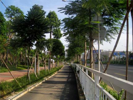 眼前的这条道路开阔大气、绿色生态,而当初施工时,却面临着很多难题。该项目定位较高,工期短,交叉施工严重,更经历了滨海的台风季节天气,所以施工中对施工工序组织、材料组织及机械劳动力的组织显得尤为重要;由于施工范围处于交通繁忙的205国道深圳段,对施工现场车辆的疏导及路边作业的围护等的要求都需严格把控;为了保证景观效果,对苗木的要求比较高,很多假植的苗木需要用保鲜的方法长途运载到施工现场进行种植。“施工中面临的各种不利因素不但增加了工程成本,更加大了施工难度,但在项目部全体人员工的共同努力下,最终克服种种困难,圆满完成了任务,展现了杭州市园林绿化工程有限公司优质高效、创新进取的企业形象,受到各方的一致好评。”徐向明的一番简短话语,却让我们感受到了施工期间的诸多辛苦。