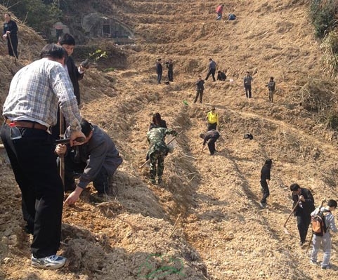 此次种植的是油茶小苗,为了提高树苗的成活率,专门请来当地农民,详细讲解种植的步骤、间距等种植要点及注意事项。随后,大家两人一组,兴致高昂地开始了种树,挖穴、种苗、填土……经过一个小时的紧张劳动,500多株油茶树就种好了。