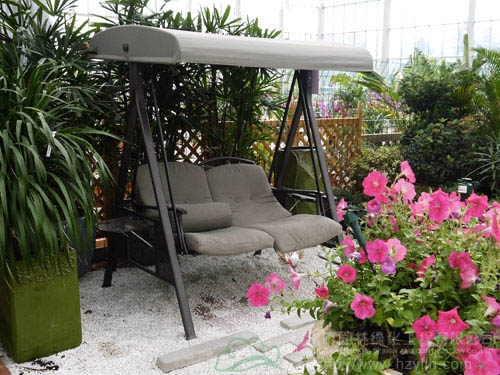 荡秋千,是儿时记忆中最快乐的玩乐方式之一,在那一荡一荡的秋千中,曾留下了多少欢声笑语和快乐的童年时光。穿过为园艺爱好者设计的庭院景观,眼前的这处小景,最引人注目的就是这架做工精美又不失稳重的布艺秋千,轻易地让人联想到一家人在此玩乐的温馨画面。这处现代庭院风格的小景,线条简约,颜色鲜明,铺设木平台以烘托温馨的生活气息,铁艺的室外桌椅以及精致的装饰用品,无不显示出对美好生活的享受与追求。这种类型的小景不受庭院风格限制,庭院的主人可以根据自己的爱好,营造出独属于自家的景观特色。