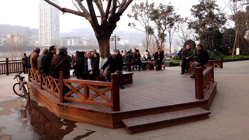 “我们将馆驿嘴广场的设计基调定位为‘奢华’, 是指使用的材料要‘真材实料’,施工工艺要经得起考验。”李寿仁边走边介绍说,“涟漪广场上的冰裂纹图案铺装,采用两种颜色的花岗岩,为了营造出气泡的效果,特意将圆形的花岗岩用不绣钢镶边,加深色彩,形成对比,从而营造出‘激起涟漪无数’的奥妙,实现馆驿嘴这艘航船动起来的效果,为了保证施工质量,工人都是从杭州请来的专业人员;所有的青石铺装,全部采用人工石刻,我们现在看到的这些菠萝面、荔枝面等纹路,是几百名能工巧匠一凿一凿刻出来的,这种自然、厚重、原生态的质朴美,是机器切割无法实现的,更重要的是,大量青石的运用,可以有效抵抗洪水的冲刷,就算50年一遇的洪水来袭也不怕;反映泸州民俗生活的三缺一麻将雕塑,则是用全铜制作,人物形态惟妙惟肖,纹路雕刻精致细腻,彰显出工艺的用心和考究;亭、廊等木结构建筑则采用实木制作,对木质材料和厚度都有严格的要求,达到美观与实用兼顾的要求。”