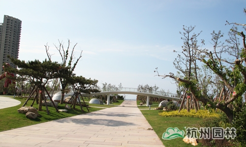 人行路桥高6米,长60米,与园路相互连接,立于桥上,可观四季美景,览海滩盛宴,是广场中观景的好去处。