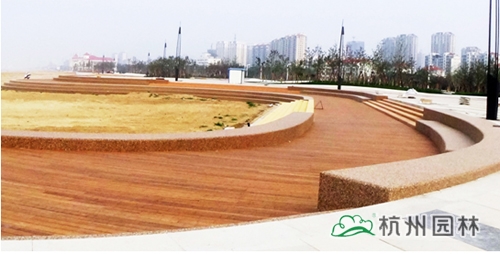 滨海广场是滨海片区建成的首个大型景观广场,整个广场以开发区展馆为中心,分为东西两大块,东边以广场铺装为主,西边以植物配置为主。结合大面积铺装、竹木地板、彩胶石、园路及特色植物配置,将整个广场分为七大观赏区,分别是露天剧场、雕塑小品、人行路桥、活动广场、异形种植池、滑板坡道、挡浪墙和波浪形台阶。工程以现代风格为主题,呈现一种时尚与实用相结合的现代园林景观特色,是一个集休闲、娱乐、康体健身于一体的海滨标志性区域。