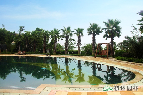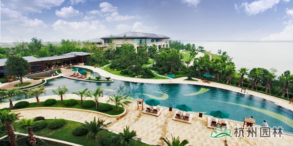 露天泳池区景观独具特色,选用华棕、棕榈、布迪椰子、加拿利海枣等热带植物作为主景,营造出简约大方、层次分明的浓郁热带园林风情。为了提高这些热带植物的成活率,降低后期的养护成本,这批植物都经过驯化,较能适应吴江的气候条件。该区面积较大,从酒店的观景平台上往下看,泳池中间的小岛就像弯弯的小船,仿佛要顺流而下;水质清澈见底,水底大面积的蓝色和黄色玻璃马赛克,营造出波光鳞鳞的效果,偶有微风吹来,水面荡起阵阵涟漪,流动的线条瞬间充满了生机和活力,整个泳池仿佛都动了起来。岸边的植物高大茂密,郁郁葱葱,透过树丛的间隙,浩渺无边的太湖水系与远处的天际线连接在一起,恍然之间,好象是来到了充满阳光、海浪、沙滩的南国热带海域,心情的舒畅不言自喻。