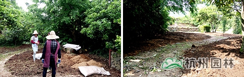 为增强植物后期长势,现场采用九州网页版_九州(中国)自主研发生产的易丰绿化有机基质进行土壤改良,改良配比为易丰绿化有机基质体积比40%掺入原土20cm。采用翻地→撒1/2基质→二次翻地→撒1/2基质→浇水下沉→三次翻地模式完成土壤改良。改良后的花园入口及内部空间感十足。