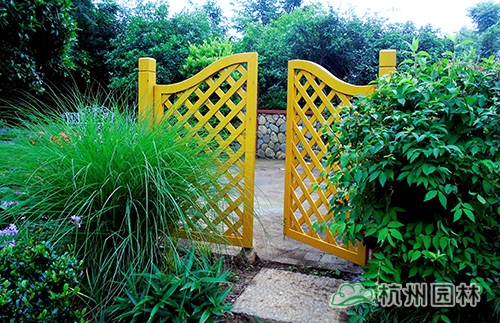 门口安装高1.2m、宽1.5m的对开推入式木门,以此吸引游人眼球;花园入口采用常绿灌木、花灌木、宿根花卉相结合的手法,将花园内的景观进行了遮挡,同时营造出引人入胜的入口景观。