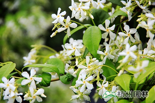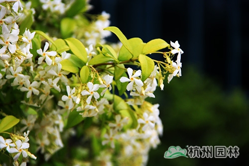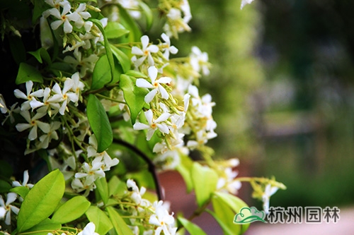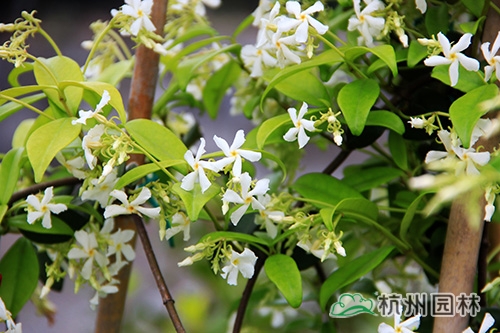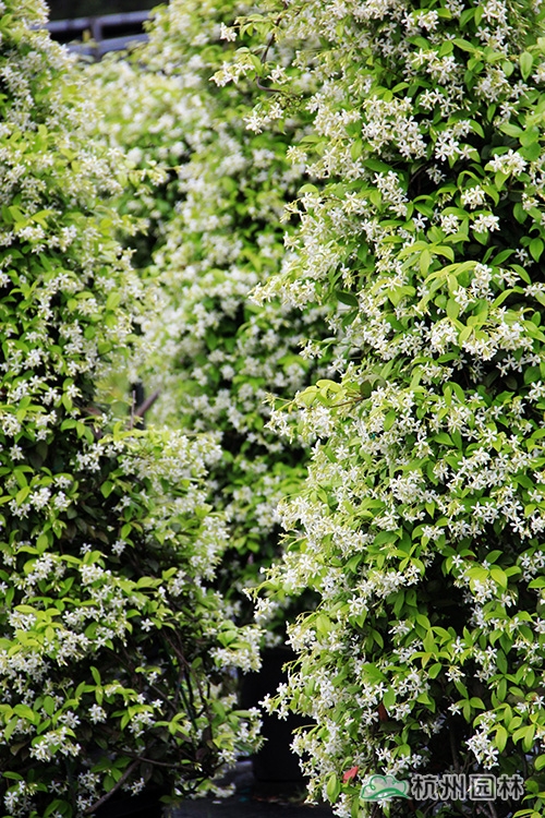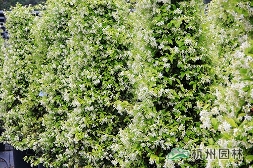 意大利白花络石藤(Rhyncospermum jasminoides),俗称风车茉莉,为夹竹桃科的常绿藤本,茎赤褐色,幼枝被黄色柔毛长,有气生根。常攀缘在树木、岩石墙垣上生长,是一流的藤蔓植物,四季常绿。开花期在夏季,5月进入盛花期,开花量极大,有茉莉的香味,闻起来沁人心脾。