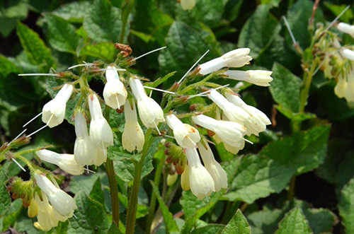 我是紫草科聚合草属植物,丛生型多年生草本,作为高产饲料作物被世界各地广为熟知,全株被向下稍弧曲的硬毛和短伏毛,聚伞花序,花序含多数花,花冠黄白色,花期3-5月,株高20-30cm。低矮紧凑可作为林下地被使用。还为低矮植物找不到发愁吗?找我,找我,找我!