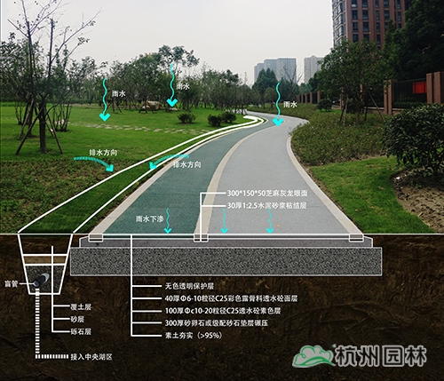 在东湖路市民公园中,采用了透水混凝土、透水砂石、透水卵石铺装。