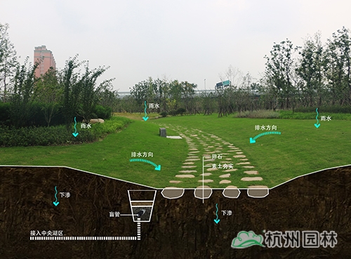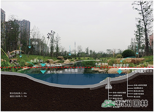 采用“景观水系——长效雨水收集系统”和“景观旱溪——短时雨水缓排系统”两种方法进行雨水收集。