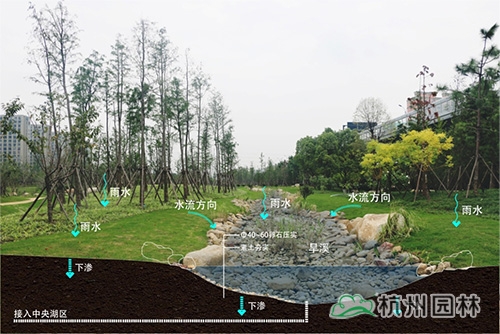 旱溪布置于带状绿地低洼处。设计时仿造自然界中干涸的河床,配合湿生植物的营造,在意境上表达出溪水的景观。降雨时可减缓地表径流,起到缓排作用。旱溪底部接盲管,将水导入中央湖区,进行储存。