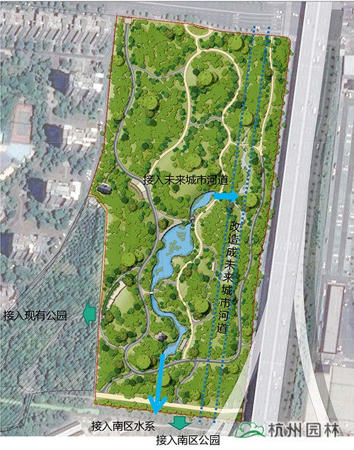 江干区东湖路市民公园位于东湖路与九乔街西南角,毗邻九月庭院和泊林印象小区,是江干区“一带生态功能区”的“运河—钱塘江—东湖路”U型生态轴的重要节点。结合已建成公园和高架互通施工预留地,对东湖路市民公园进行统一规划。