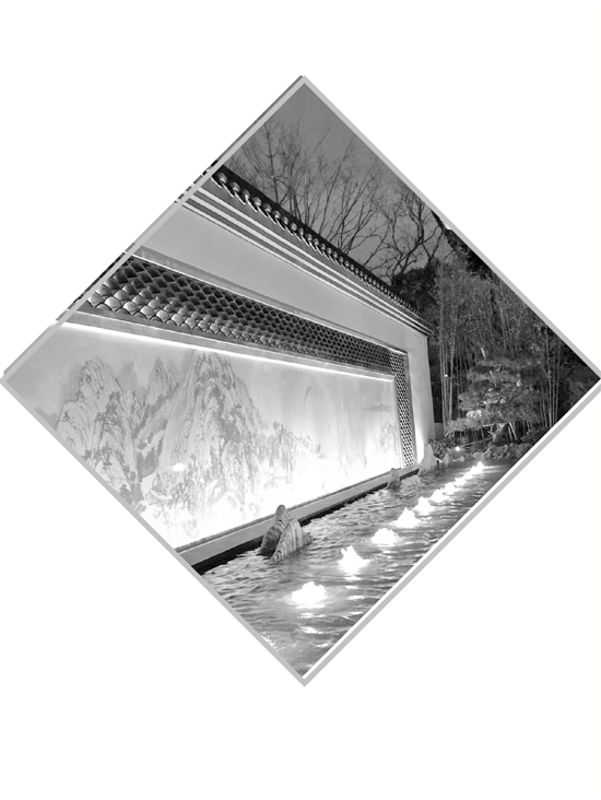 园区主入口,游人一进园,就能看到大瀑布和亭子,再加上富春山居图造壁,呈现出浙江山水风景特点。浙江省地形复杂,其中三分之二的面积是山地丘陵,所以,浙江园也是依此而建的。为了能让往来的游客在进园时就直观的感受到这种景观效果,卢山和团队为游客们设计了两条游览线,一条从入口进来之后向山上走,体验登高望远,感受山林景观的游览过程;还有一条是从庭院路线走的,就是让游客有行走在家宅的感觉。在设计时,卢山选取了明清时期的建筑形态,粉墙黛瓦。建筑上层是黑的,墙是白的,展现出浙江传统建筑的文化元素。卢山还说:“众所周知,浙江的茶叶非常有名,我们在展园里打造成了一个茶山景观,再配上一些花卉。总体上,是要展示出一个富美浙江主题的庭院。”