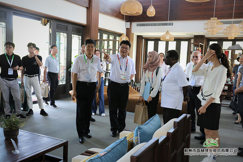 移步大露台,嘉宾们凭栏眺望,小桥流水,花木葱郁,“花园浙江”景致如诗如画。胡侠局长详细介绍了“浙江园”的设计主题、结构布局和意境表达,嘉宾们频频点头赞许,对浙江园的建设给予了高度评价,认为浙江园较好地展现了美丽浙江景象和生态文明建设成果。