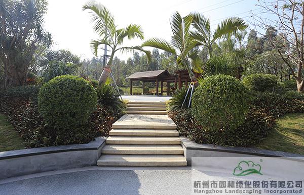 地被植物和小灌木充实园林的下层空间,往往起到“镶边”的效果,如果种植不好,很容易使底部出现裸露的土壤,景观效果大打折扣。而该项目在现场放样之后,先对地形进行处理,形成一定的坡度,然后在地被植物或小灌木种植时,上面坡度高的地方平种,随着逐渐向下方边缘靠近,植物种植向下方倾斜,逐步过渡,从上到下形成弧线,将土壤遮盖。“这种处理手法,不但使下层空间看着自然美观,而且避免了地面出现裸露情况。”叶伟华的言语中,不经意间流露的,是杭园人对细节的极致追求。