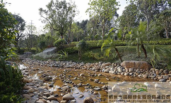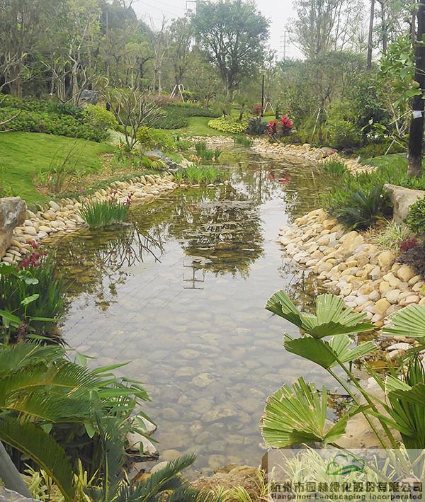 下雨时蓄水,用于植物的日常浇灌;干旱时,铺满鹅卵石的水底又可与周边丰富的植物营造出另一种园林意境