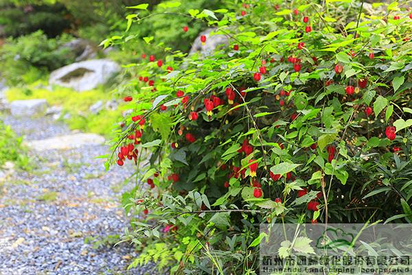 红萼苘麻的花朵就像一个个红灯笼,使原本沉闷的石头充满了自然的野趣。