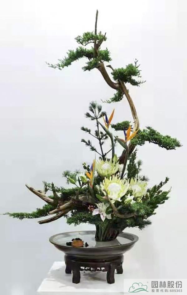 另有极富意境的《云崖青峤》插花作品,选崖柏、龙柏、铺地柏、五针松、帝皇花、重瓣百合花、粉色和白色金丝桃、天堂鸟,以成云崖青峤之作。云为雅意,崖寓故训,青色入观,峤在画外。如此,松风若过,花开舒卷,青红果结,临水照影。清涧之曲,碧松之阴,相映成趣,着手成春矣。