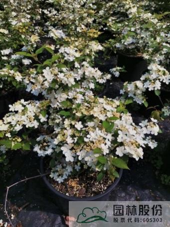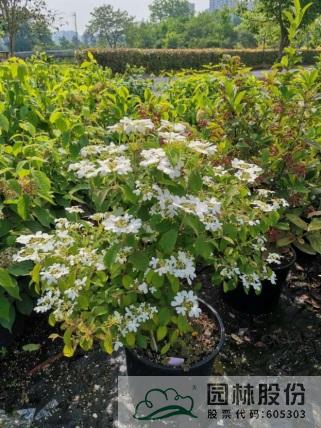 忍冬科荚蒾属,落叶灌木,株高可达1.8m,植株紧凑飘逸。春季新叶边缘具红色纹。聚伞花序白色,开于枝顶,外围为一圈不孕花,可孕花位于中间,是目前国内现有的荚蒾品种中花期最长的一个,可从春季开始一直开到秋季,盛花通常4月中旬至5月中旬。冬季至早春可修剪。一年施肥3次,早春萌芽前,盛花期后及秋季。分枝能力强,适合园艺盆栽或庭院观赏。