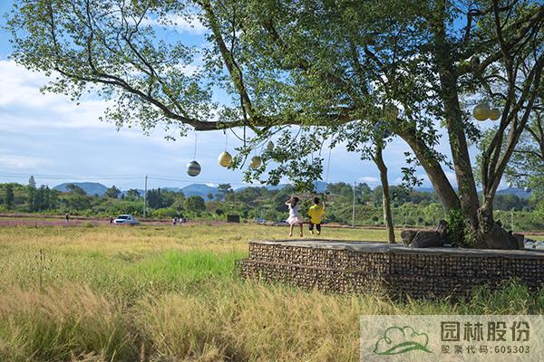 旁边的一个树岛,用柴火和钢管做出“鸟巢”形状,虽稍显“凌乱”,但却显得分外自然;另一个树岛,则增加“五指”塑石景观,远远望去,好像一只大手托举着大树。穿过田间小路,来到几棵大树组成的树林,错落有致的景石形成一个自然的围合空间,林间小路用旧木头铺成,道路两边用紫色鼠尾草、刀茅等植物巧妙搭配出清新的花境。这样一种景观设计,使游客坐在树下的石头上小憩时,看着孩子们在此地追逐嬉戏,很容易唤起对于儿时故乡的回忆,这便是这个景观设计时的初衷。