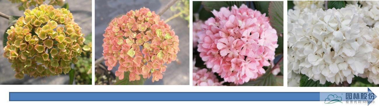 忍冬科荚蒾属,落叶灌木,日本引进,株高可达2.5-3m。新叶成暗红色,后呈绿色,秋色叶颜色多变。整个花序都是不育花,球形,花苞粉绿色,开放后淡粉色,最后变成白色。它适应我国大部分地区种植,生长相对缓慢,适合园艺盆栽或庭院观赏。