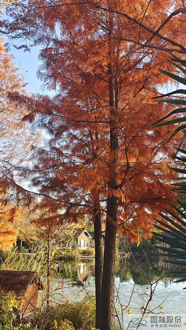 在初冬的日子里,怎能少了水杉、池杉、水松这类落叶针叶树呢。远看,褐色的枝叶、竖向的线条,满满的都是初冬的静谧。如果在林下的园路穿梭,还能看到细细密密的落叶洒满林间,丝丝缕缕的阳光洒落进来,好希望时间一直停留在这一刻。