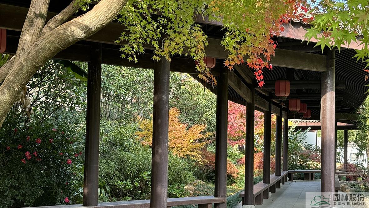 中式庭院中,红枫将古色古香的木结构长廊衬托的更具江南古典园林气息