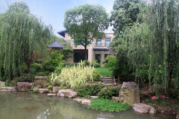 “水,是园林景观中的灵动之魂,也是江南园林的特点之一,特别是与800亩泱泱碧波的大淀湖为邻,绿洲•江南园别墅景观工程本身就有着营造水景的天然优势”,徐建良指着眼前的一处河水说,“为了营造自然、丰富的水体景观,工程中的水景不但有瀑、跌、溪、河、湖等自然景观元素,也有欧式中的喷、池等,中西方园林的水景模式有机融合,满足了业主们回归自然、享受自然的多样性需求。”的确,眼前这处蜿蜒的河道,驳岸两边自然地散落着大大小小的太湖石、黄石,慈姑、千屈菜、花叶芦竹、菖蒲等水生植物郁郁葱葱,岸边柳树垂下长长的柳条,偶尔一阵风吹来,水波轻漾,一幅浑然天成的水乡风光让人沉醉。